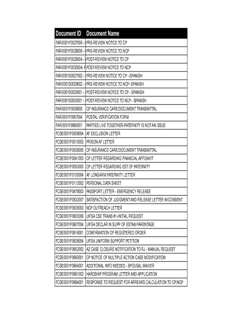 Document IDDocument NameFARI0001F0027006 PreReview PREREVIEW Notice NOTICE to CP TO CP FARI0001F0028006 PreReview PREREVIEW Notice NOTICE to NCP TO NCP FARI0001F0029004 PostReview POSTREVIEW Notice NOTICE to CP TO CP FARI0001F0030004 PostReview POSTREVIEW Notice NOTICE to NCPTO NCP FARI0001S0027002 PreReview PREREVIEW Notice NOTICE to CPTO Spanish CP SPANISH FARI0001S0028002 PreReview PREREVIEW Notice NOTICE to NCP TOSpanish NCP SPANISH FARI0001S0029001 PostReview POSTREVIEW Notice NOTICE to