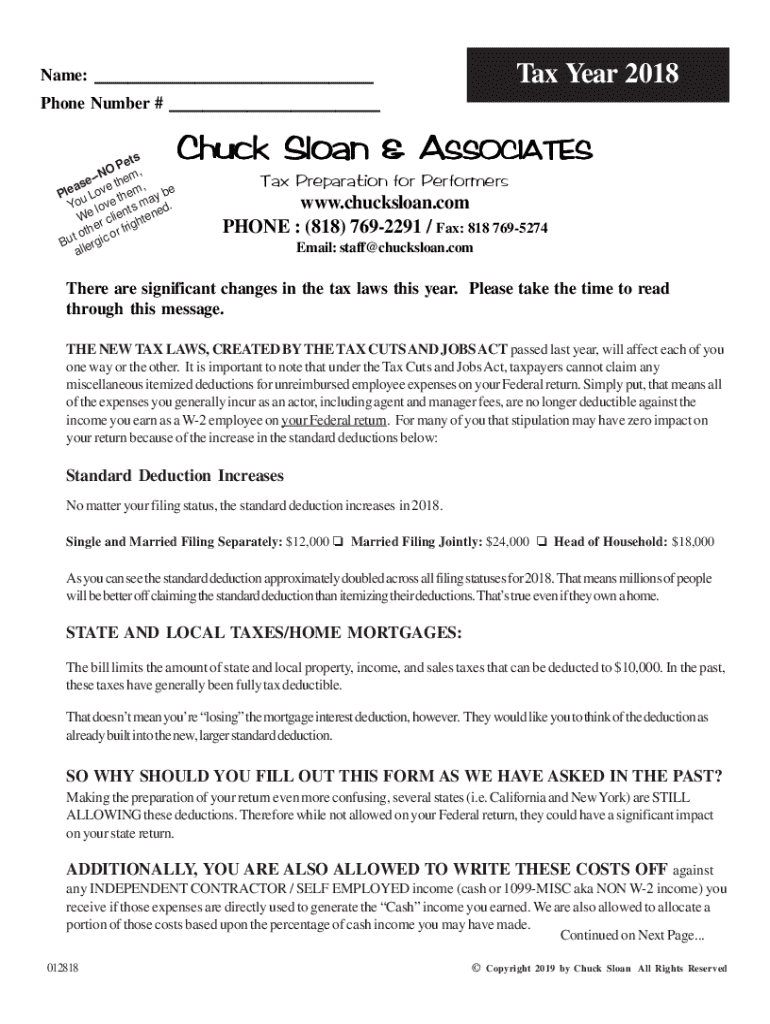 Tax Year 2018___ Phone Number # ___ Name:ets O P m, N e , ase e th Ple u Lov them ay be e o Y lov ts m ed. We r clien hten he or frig t ot Bu llergic aChuck Sloan & ASSOCIATES Tax Preparation for