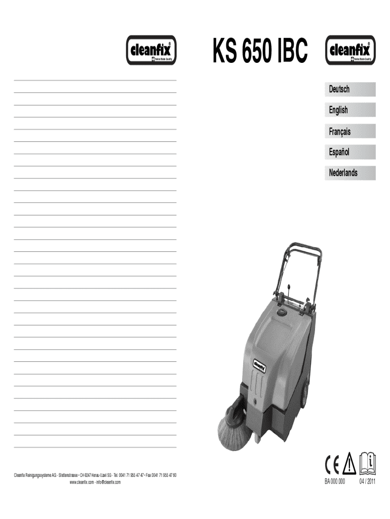 Swiss Made Quality.KS 650 IBCSwiss Made Quality.Deutsch English FranaisEspaol NederlandsSwissCleanfix Reinigungssysteme AG Stettenstrasse CH9247 HenauUzwil SG Tel. 0041 71 955 47 47 Fax 0041 71 955 47 60 www.cleanfix.com info@cleanfix.comMadeQuality.BA 000.00004 / 2011EinfhrungDVorwort Sehr geehrter Kunde, es ist unser Wunsch, dass die guten Eigenschaften der Maschine das Vertrauen rechtfertigen, welches Sie uns durch Ihren Kauf entgegengebracht haben