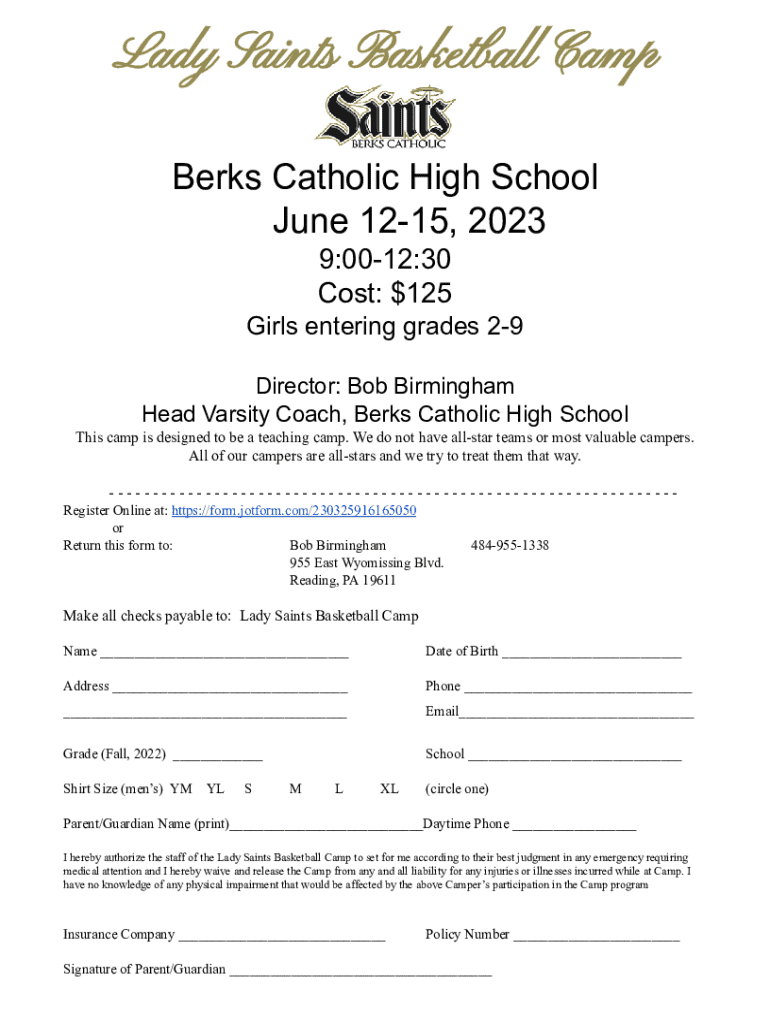 Lady Saints Basketball Camp Berks Catholic High School June 1215, 2023 9:0012:30 Cost: $125 Girls entering grades 29 Director: Bob Birmingham Head Varsity Coach, Berks Catholic High School This camp