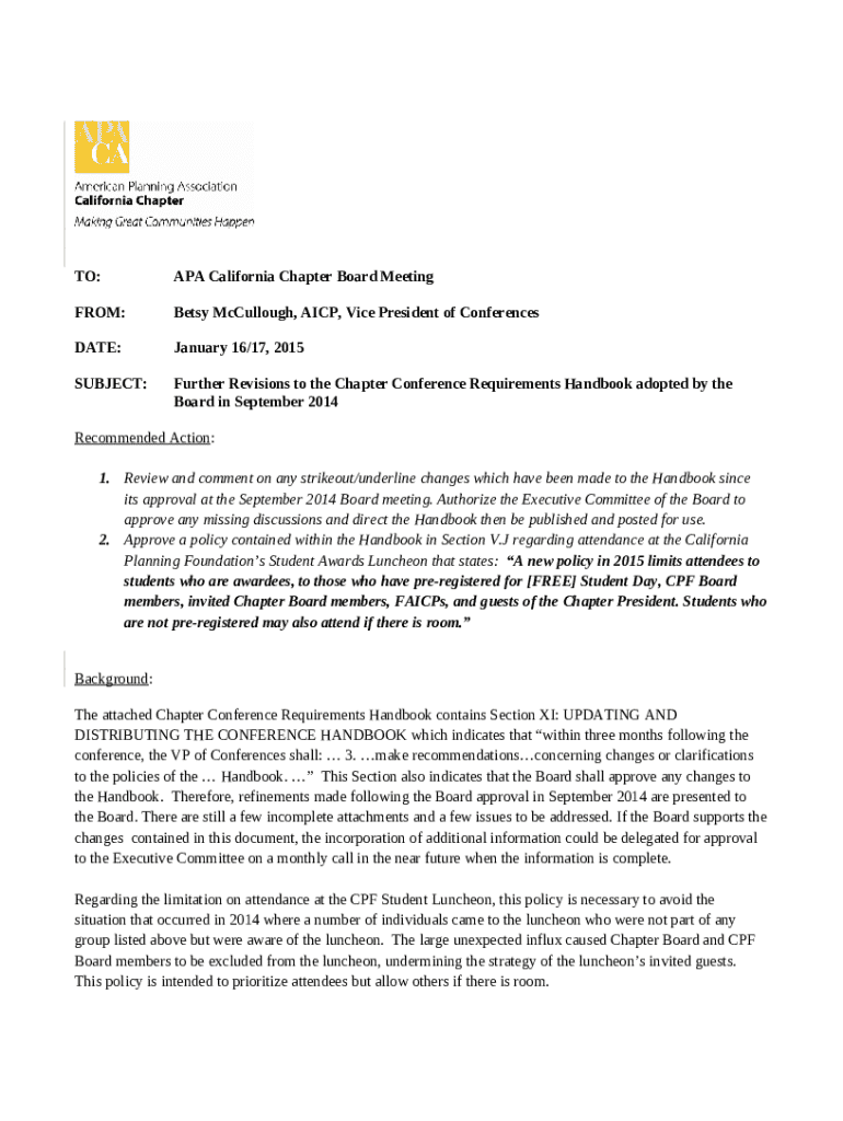 The Board of Directors - American Planning Association ... is a fillable form in MS Word extension that has to be completed and signed for specified reasons. In that case, it is provided to the exact addressee in order to provide certain info of certain kinds. The completion and signing may be done in hard copy or with a trusted service like PDFfiller. These tools help to send in any PDF or Word file without printing out. It also allows you to customize its appearance according to your requirements and put legit e-signature. Once you're good, you send the Board of Directors - American Planning Association ... to the respective recipient or several ones by email and even fax. PDFfiller offers a feature and options that make your template printable. It offers a number of options when printing out. No matter, how you'll deliver a form - in hard copy or electronically - it will always look well-designed and clear. To not to create a new file from the beginning all the time, turn the original form as a template. After that, you will have a rewritable sample.