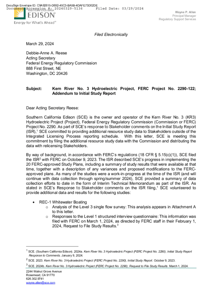 DocuSign Envelope ID: C9A92615D69245C3BA5B4DAFE73D02DEDocument Accession #: 202403295136Filed Date: 03/29/2024Wayne P. Allen Principal Manager Regulatory Support ServicesFiled Electronically March 29, 2024 DebbieAnne A. Reese Acting Secretary Federal Energy Regulatory Commission 888 First Street, NE Washington, DC 20426Subject:Kern River No. 3 Hydroelectric Project, FERC Project No. 2290122; Addendum to Initial Study ReportDear Acting Secretary Reese: Southern California Edison
