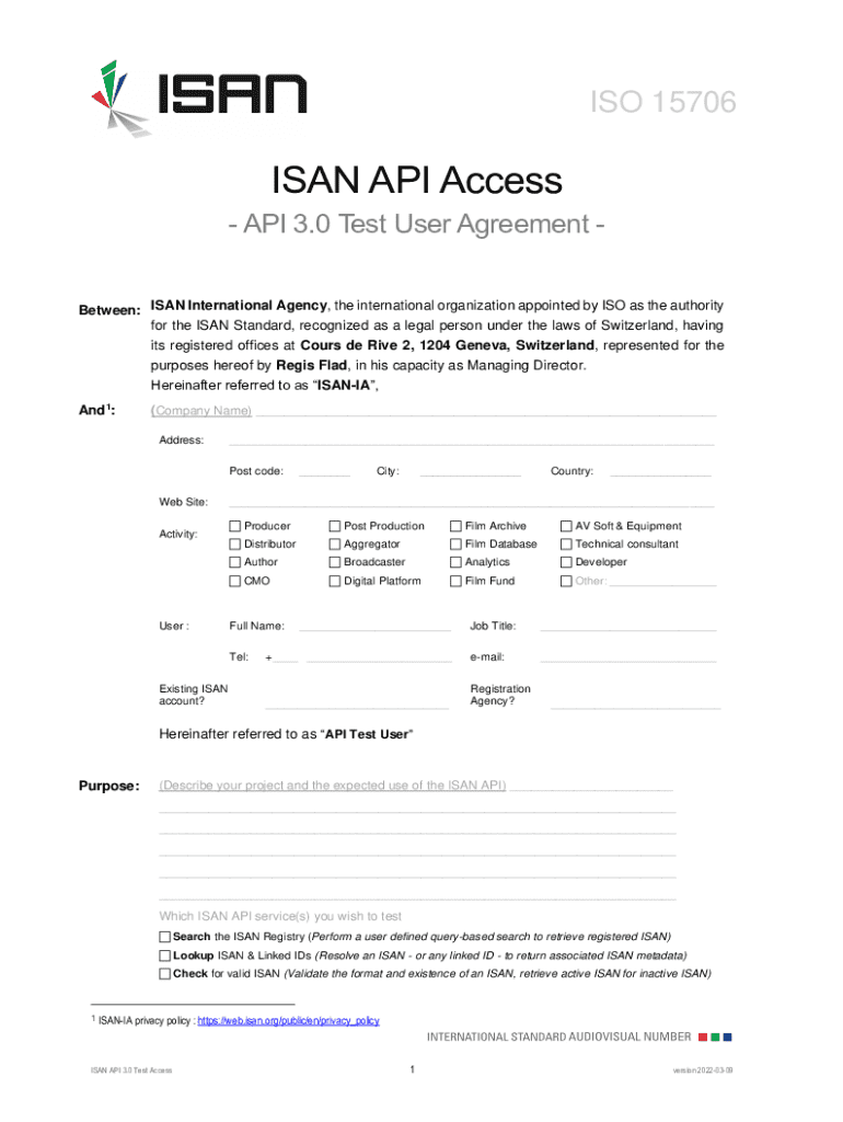 Get the free ISAN API 3.0 Test Access. ISAN API Access - API 3.0 Test User Agreement -