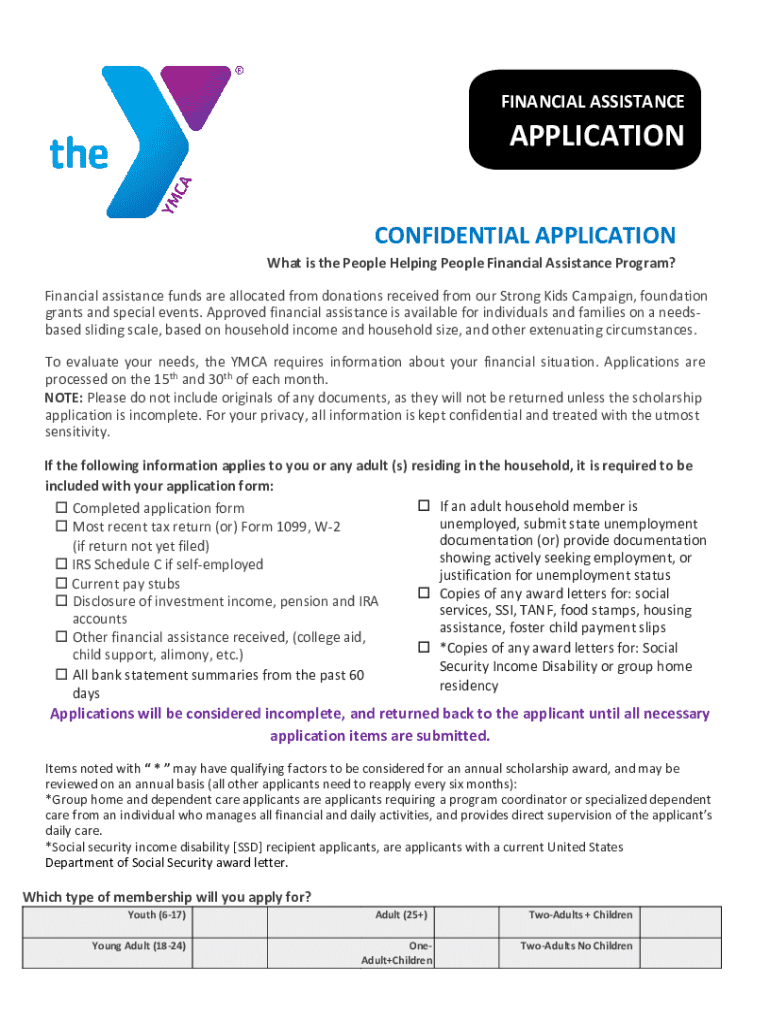FINANCIAL ASSISTANCEAPPLICATION CONFIDENTIAL APPLICATIONAnnual SupportWhat is the People Helping People Financial Assistance Program? Financial assistance funds are allocated from donations received from our Strong Kids Campaign, foundation grants and special events. Approved financial assistance is available for individuals and families on a needsbased sliding scale, based on household income and household size, and other extenuating circumstances. To evaluate your needs, the YMCA requires...