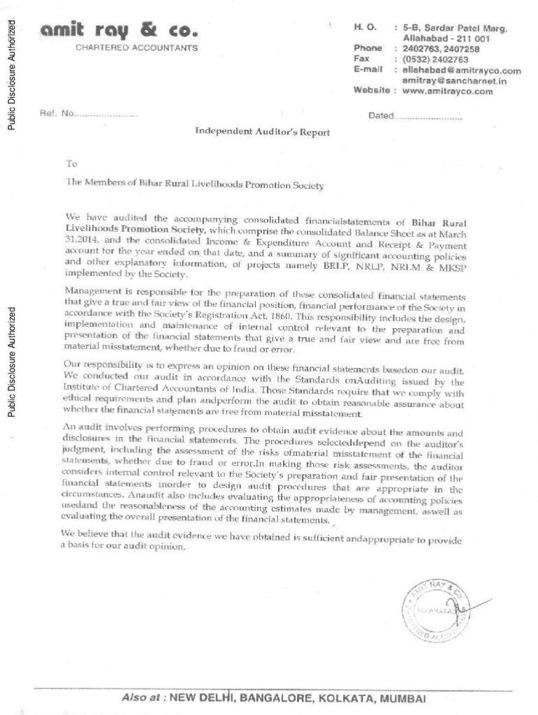 Public Disclosure Authorized Public Disclosure Authorized Public Disclosure Authorized Public Disclosure Authorizedomit ray & co. CHARTERED ACCOUNTANTSRef. No.H. 0.: 5B, Sardar Patel Marg.Allahabad 211 001 : 2402763,2407258 : (0532)2402763 : allahabad@amitrayco.com amitray@sancharnet.in Website : www.amitrayco.com Phone Fax EmailDated...........Independent Auditor\'s ReportTo The Members of Bihar Rural Livelihoods Promotion SocietyWe have audited the accompanying consolidated