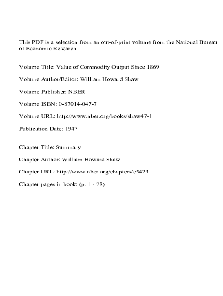 This PDF is a selection from an outofprint volume from the National Bureau of Economic Research Volume Title: Value of Commodity Output Since 1869 Volume Author/Editor: William Howard Shaw Volume Publisher: NBER Volume ISBN: 0870140477 Volume URL: http://www.nber.org/books/shaw471 Publication Date: 1947 Chapter Title: Summary Chapter Author: William Howard Shaw Chapter URL: http://www.nber.org/chapters/c5423 Chapter pages in book: (p. 1 78)PARTISummaryT historian they give threads