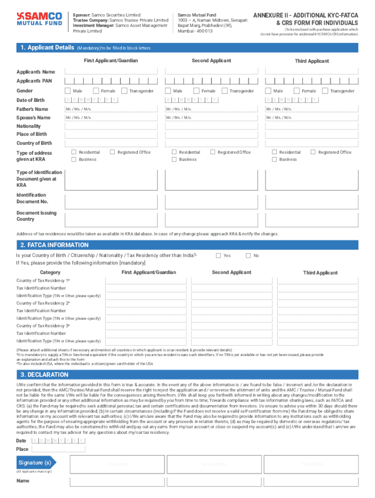 Sponsor: Samco Securities Limited Trustee Company: Samco Trustee Private Limited Investment Manager: Samco Asset Management Private Limited1. Applicant DetailsSamco Mutual Fund 1003 A, Naman Midtown, Senapati Bapat Marg, Prabhadevi (W), Mumbai 400 013ANNEXURE II ADDITIONAL KYCFATCA & CRS FORM FOR INDIVIDUALS (To be enclosed with purchase application which do not have provision for additional KYC/FATCA/CRS information)(Mandatory) to be filled in block lettersFirst Applicant/GuardianSecond