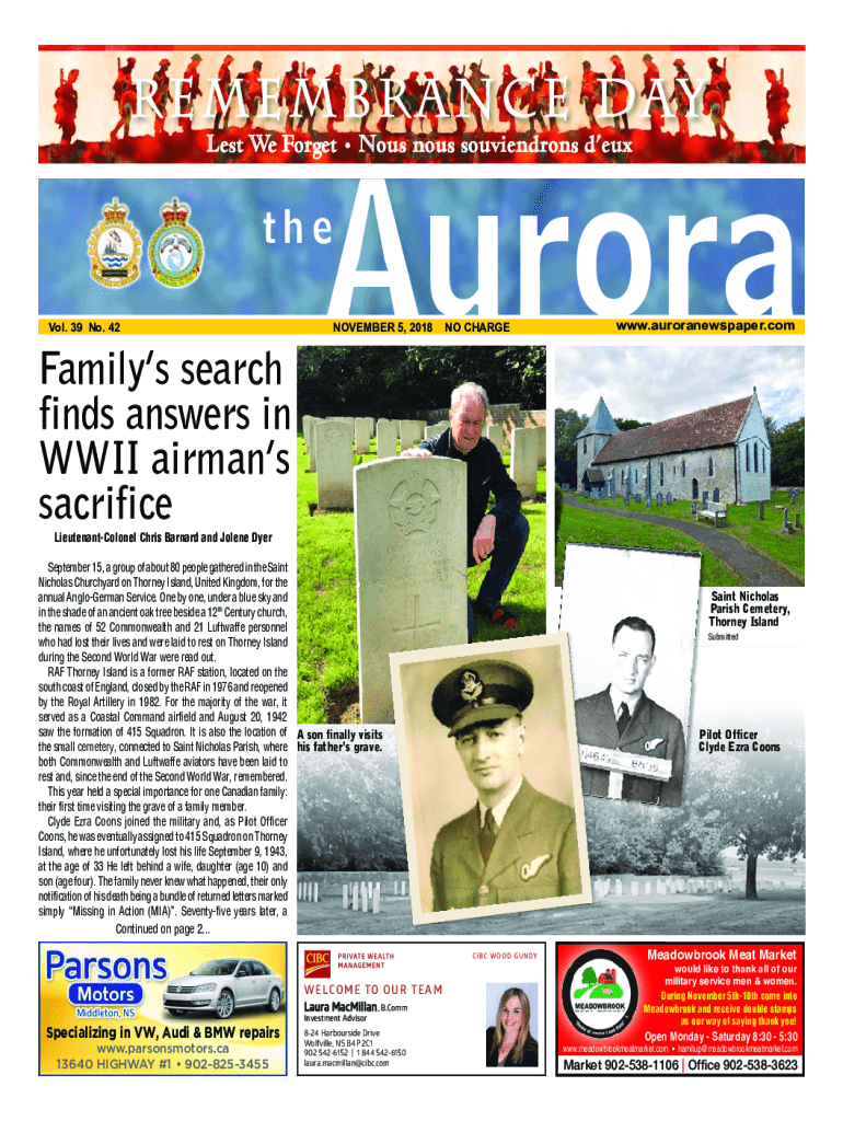R e m e m b r a n c e D ay Lest We Forget Nous nous souviendrons deuxAurorathe Vol. 39 No. 42Familys search finds answers in WWII airmans sacrificeNOVEMBER 5, 2018NO CHARGEwww.auroranewspaper.comLieutenantColonel Chris Barnard and Jolene DyerSeptember 15, a group of about 80 people gathered in the Saint Nicholas Churchyard on Thorney Island, United Kingdom, for the annual AngloGerman Service. One by one, under a blue sky and in the shade of an ancient oak tree beside