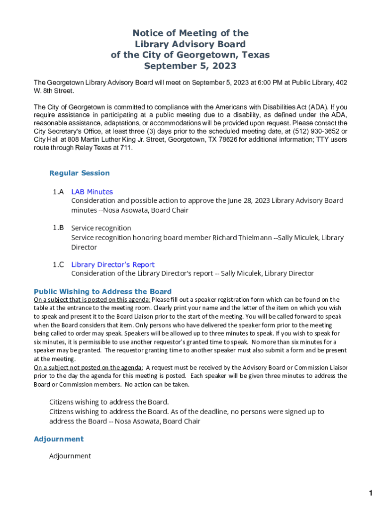 Notice of Meeting of the Library Advisory Board of the City of Georgetown, Texas September 5, 2023, The Georgetown Library Advisory Board will meet on September 5, 2023, at 6:00 PM at Public Library,