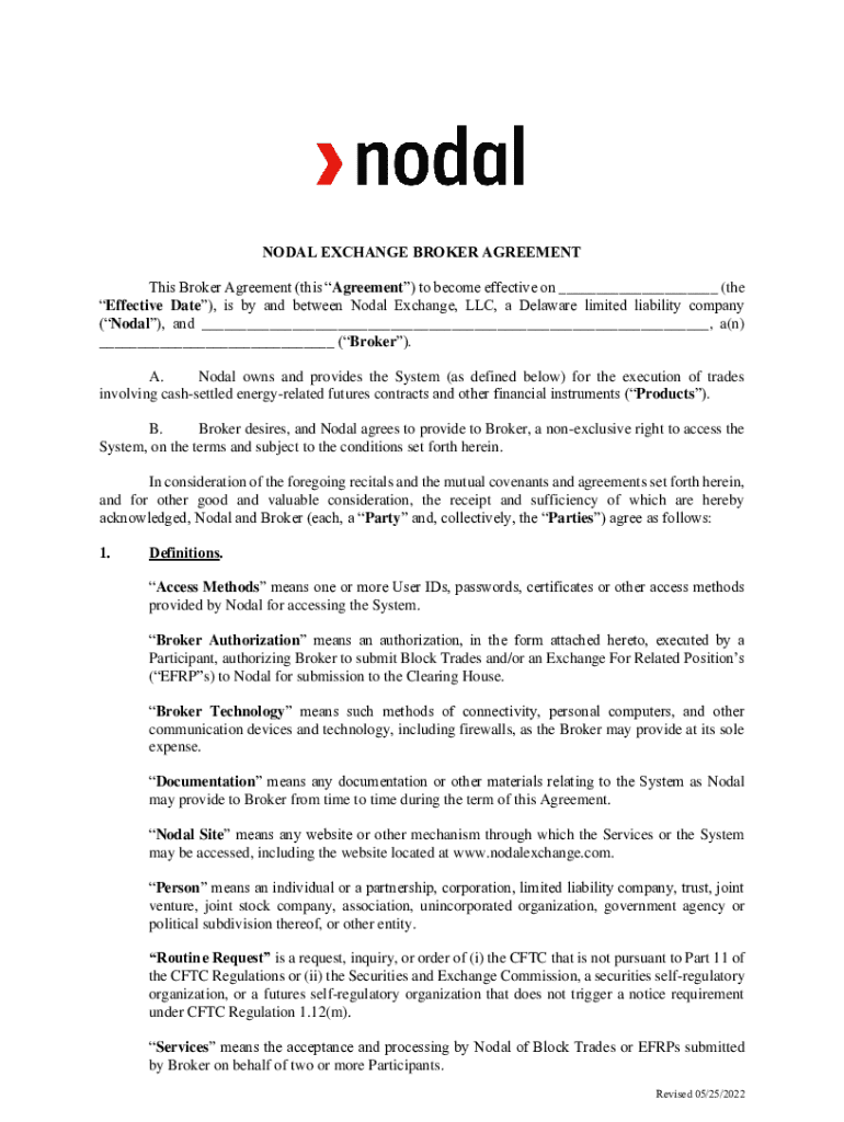 NODAL EXCHANGE BROKER AGREEMENT This Broker Agreement (this Agreement) to become effective on ___ (the Effective Date), is by and between Nodal Exchange, LLC, a Delaware limited liability company (Nodal), and ___, a(n) ___ (Broker). A. Nodal owns and provides the System (as defined below) for the execution of trades involving cashsettled energyrelated futures contracts and other financial instruments (Products). B. Broker desires, and Nodal agrees to provide to Broker,