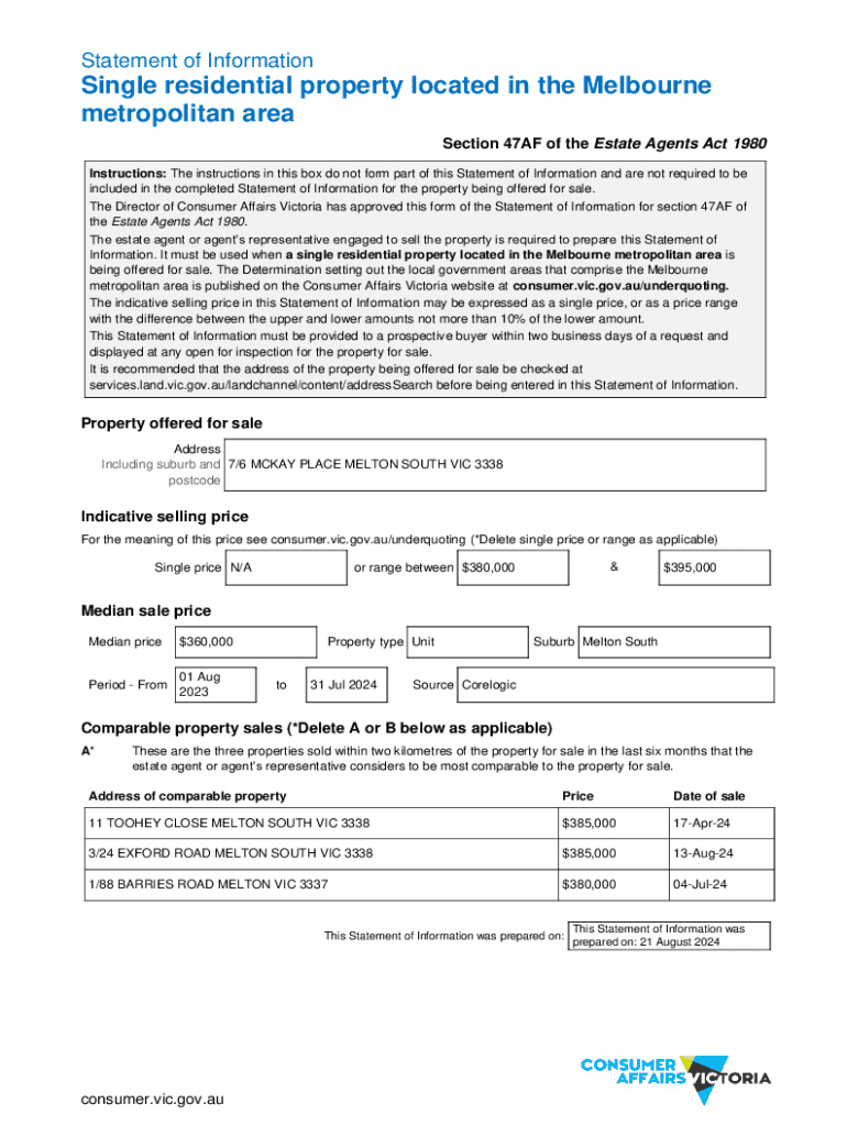 Statement of InformationSingle residential property located in the Melbourne metropolitan area Section 47AF of the Estate Agents Act 1980 Instructions: The instructions in this box do not form part