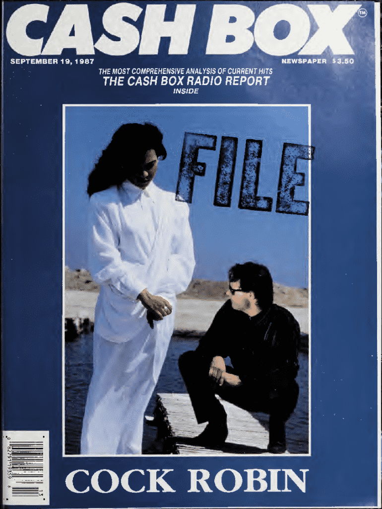 SEPTEMBER19,NEWSPAPER $3.501987 THE MOST COMPREHENSIVE ANALYSIS OF CURRENT HITSTHE CASH BOX RADIO REPORTi|66U16ZZ8COCK ROBIN161CASH BOX TOP 100 SINGLES THE CASH BOX TOP100 SINGLESCHARTISBASED ON A COMBINATION OF RADIO AIRPLAY AND ACTUAL PIECES SOLD AT RETAIL STORES. Lastg|JUST CAN 7 STOP LOVING YOU Michael Jackson with Siedah Garrett (Epic 3407253)2 LA BAMBA (Slash/Wamer Bros. 728336) IT ALL g| DIDNT WE ALMOST HAVEHERE I752LOS LobOS21253Whitney