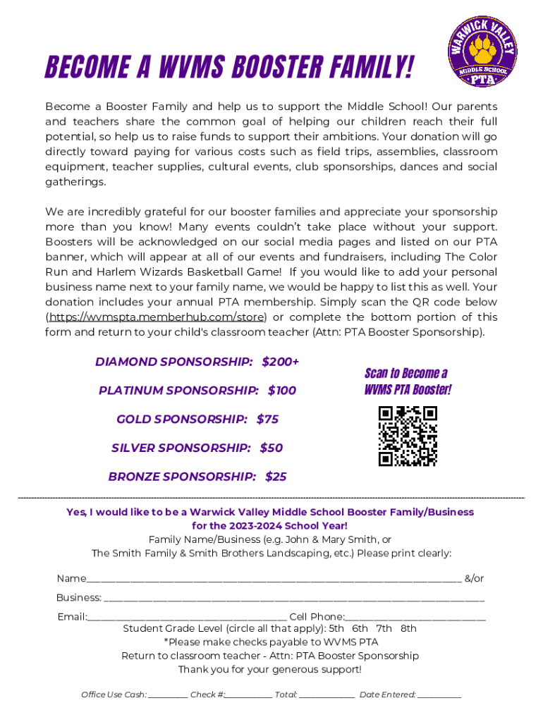 BECOME A VMS BOOSTER FAMILY! Become a Booster Family and help us to support the Middle School! Our parents and teachers share the common goal of helping our children reach their full potential, so