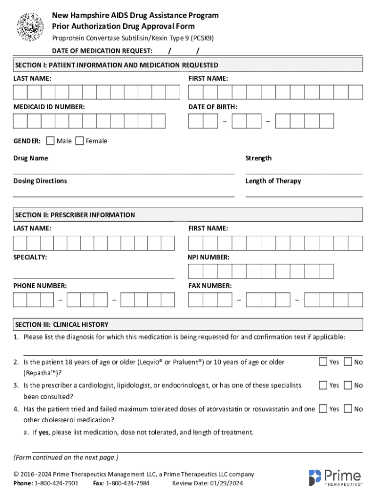 The NH Medicaid PCSK9 PA Form serves as a critical gateway for obtaining prior authorization for PCSK9 inhibitors, a class of medications used to lower cholesterol levels and reduce the risk of cardiovascular events. Prior authorization is a process that requires healthcare providers to obtain approval from Medicaid before administering certain treatments, ensuring that patients meet specific medical criteria. This form is vital for managing cardiovascular health, as it helps determine eligibility for medications that are not typically covered without prior approval.