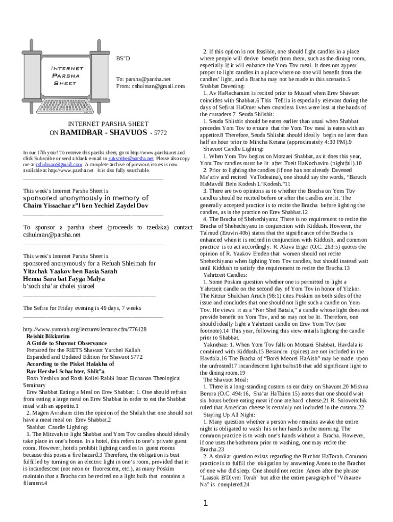 What is INTERNET PARSHA SHEET ON PINCHAS - 5785 Form?