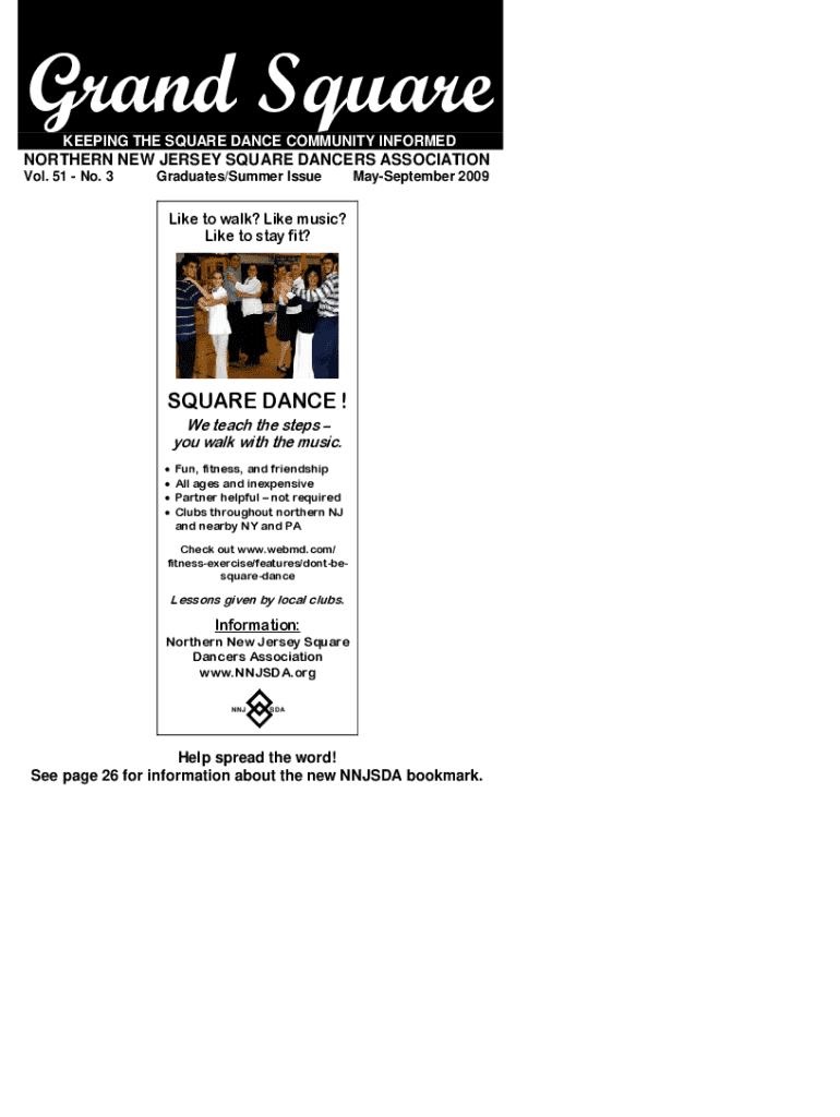 Grand Square KEEPING THE SQUARE DANCE COMMUNITY INFORMEDNORTHERN NEW JERSEY SQUARE DANCERS ASSOCIATION Vol. 51 No. 3Graduates/Summer IssueMaySeptember 2009Like to walk? Like music? Like to stay fit?SQUARE DANCE ! We teach the steps you walk with the music. Fun, fitness, and friendship All ages and inexpensive Partner helpful not required Clubs throughout northern NJ and nearby NY and PACheck out www.webmd.com/ fitnessexercise/features/dontbesquaredanceLessons given by local clubs