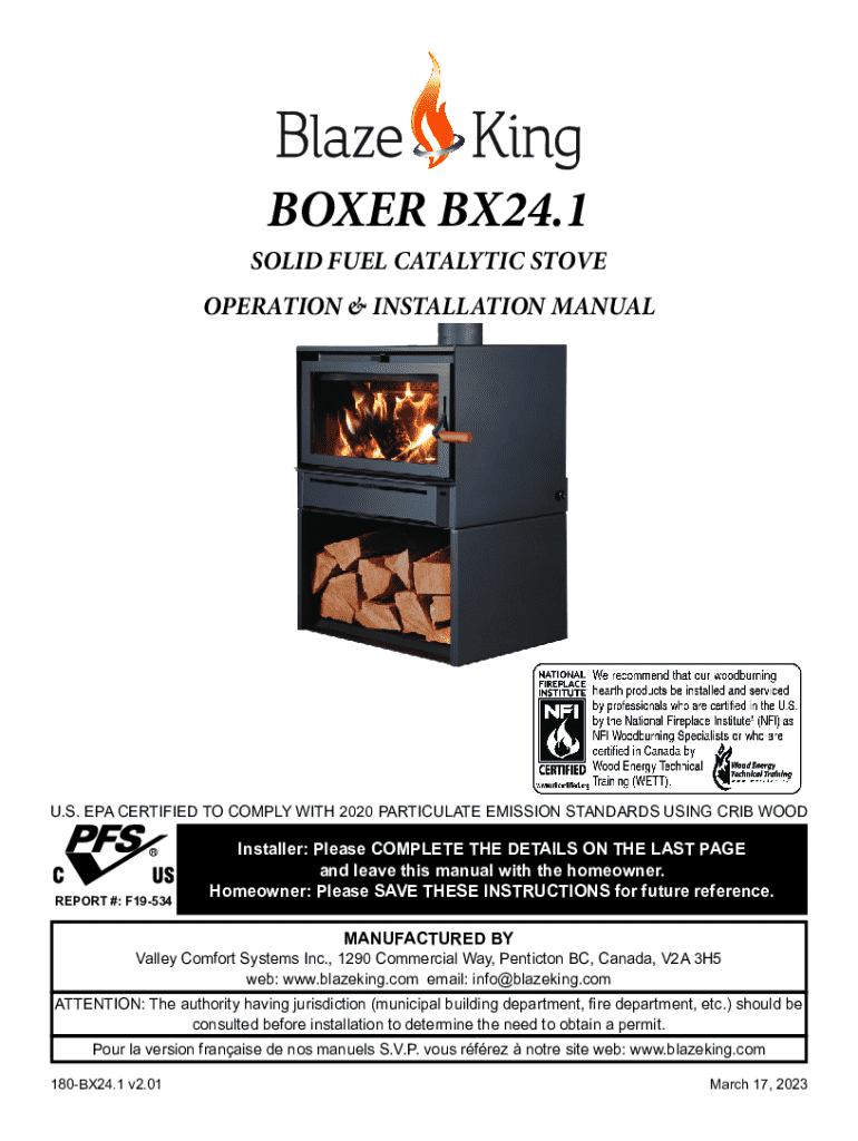 BOXER BX24.1SOLID FUEL CATALYTIC STOVE OPERATION & INSTALLATION MANUALU.S. EPA CERTIFIED TO COMPLY WITH 2020 PARTICULATE EMISSION STANDARDS USING CRIB WOODREPORT #: F19534Installer: Please COMPLETE