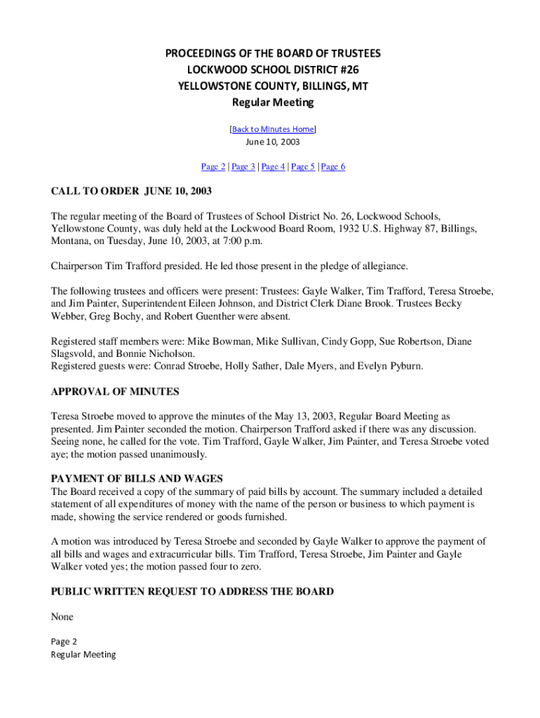 PROCEEDINGS OF THE BOARD OF TRUSTEES LOCKWOOD SCHOOL DISTRICT #26 YELLOWSTONE COUNTY, BILLINGS, MT Regular Meeting [Back to Minutes Home]June 10, 2003 Page 2 | Page 3 | Page 4 | Page 5 | Page 6CALL