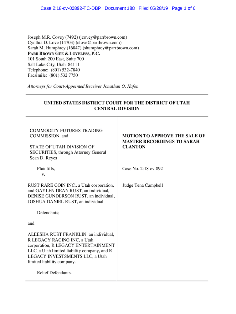 Case 2:18cv00892TCDBP Document 188 Filed 05/28/19 Page 1 of 6Joseph M.R. Covey (7492) (jcovey@parrbrown.com) Cynthia D. Love (14703) (clove@parrbrown.com) Sarah M. Humphrey (16847) (shumphrey@parrbrown.com) PARR BROWN GEE & LOVELESS, P.C. 101 South 200 East, Suite 700 Salt Lake City, Utah 84111 Telephone: (801) 5327840 Facsimile: (801) 532 7750 Attorneys for CourtAppointed Receiver Jonathan O. HafenUNITED STATES DISTRICT COURT FOR THE DISTRICT OF UTAH CENTRAL DIVISIONCOMMODITY FUTURES