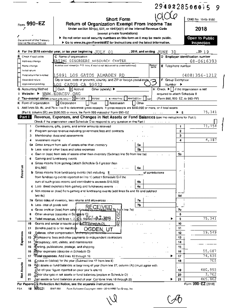 2949228506015 9 FormlC.Cf.pShort Form Return of Organization Exempt From Income Tax990EZOM8 No 154511502018Under section 501 (c), 527, or 4947(a)(l) of the Internal Revenue Code (except private foundations) Department of the Treasury Internal Revenue ServiceA For the 2018 calendar year, or tax year beginning BJULY 01,2018, and endingJUNE 30C Name of organization tATING DISORDERS RESOURCE CENTERCheck If applicable Address change,20190 Employer identification number680616393 Aoom!Number