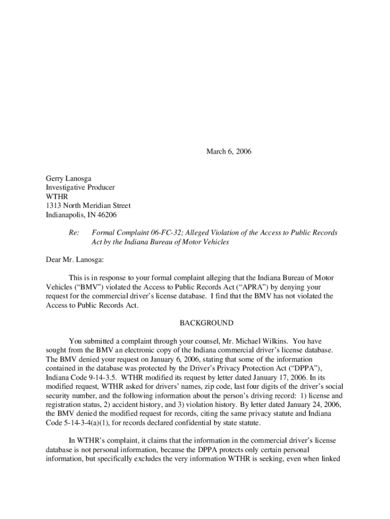 March 6, 2006Gerry Lanosga Investigative Producer WTHR 1313 North Meridian Street Indianapolis, IN 46206 Re:Formal Complaint 06FC32; Alleged Violation of the Access to Public Records Act by the Indiana Bureau of Motor VehiclesDear Mr. Lanosga: This is in response to your formal complaint alleging that the Indiana Bureau of Motor Vehicles (BMV) violated the Access to Public Records Act (APRA) by denying your request for the commercial drivers license database. I find that the