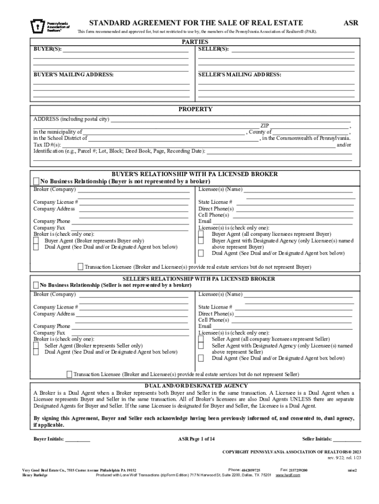 STANDARD AGREEMENT FOR THE SALE OF REAL ESTATEASRThis form recommended and approved for, but not restricted to use by, the members of the Pennsylvania Association of Realtors (PAR).PARTIES BUYER(S):SELLER(S):BUYER\'S