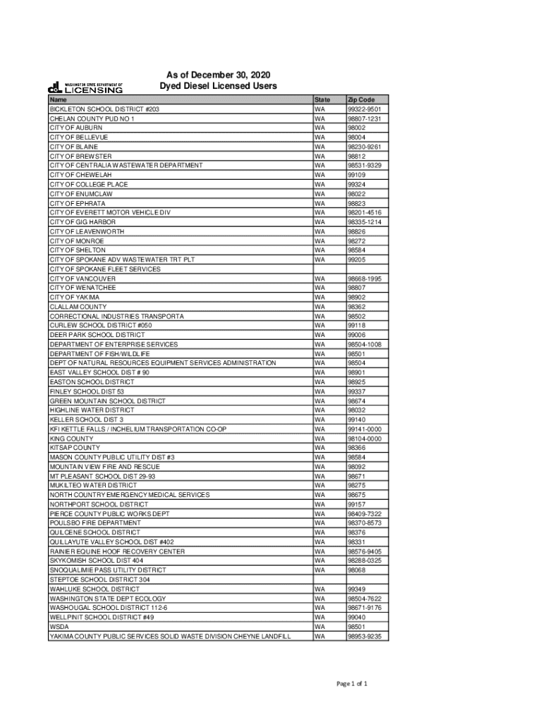 As of December 30, 2020 Dyed Diesel Licensed Users Name BICKLETON SCHOOL DISTRICT #203 CHELAN COUNTY PUD NO 1 CITY OF AUBURN CITY OF BELLEVUE CITY OF BLAINE CITY OF BREWSTER CITY OF CENTRALIA WASTEWATER