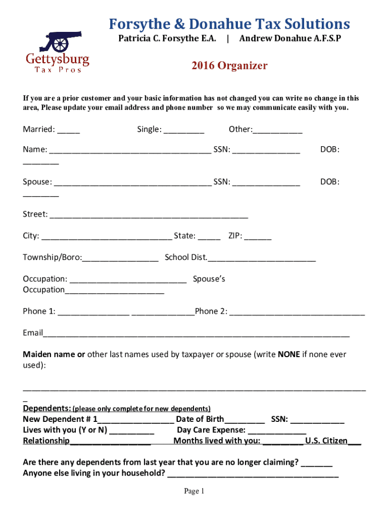 Forsythe & Donahue Tax Solutions Patricia C. Forsythe E.A.|Andrew Donahue A.F.S.P2016 Organizer If you are a prior customer and your basic information has not changed you can write no change in this