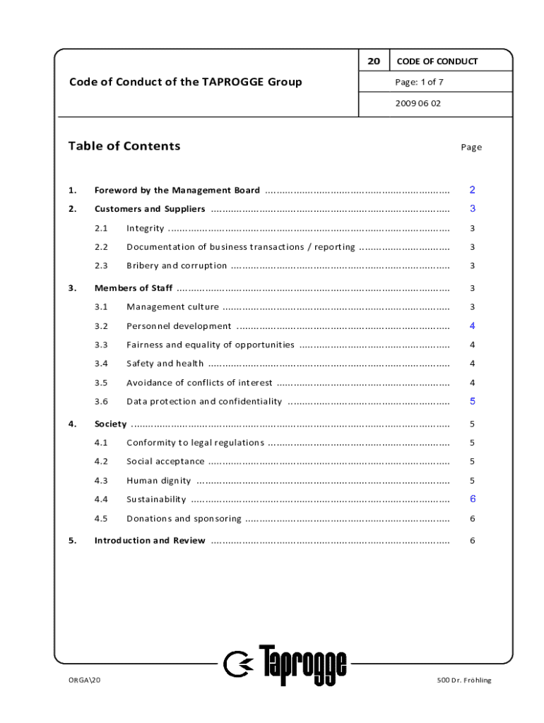 20Code of Conduct of the TAPROGGE GroupCODE OF CONDUCT Page: 1 of 7 2009 06 02Table of ContentsPage1.Foreword by the Management Board .................................................................22.Customers