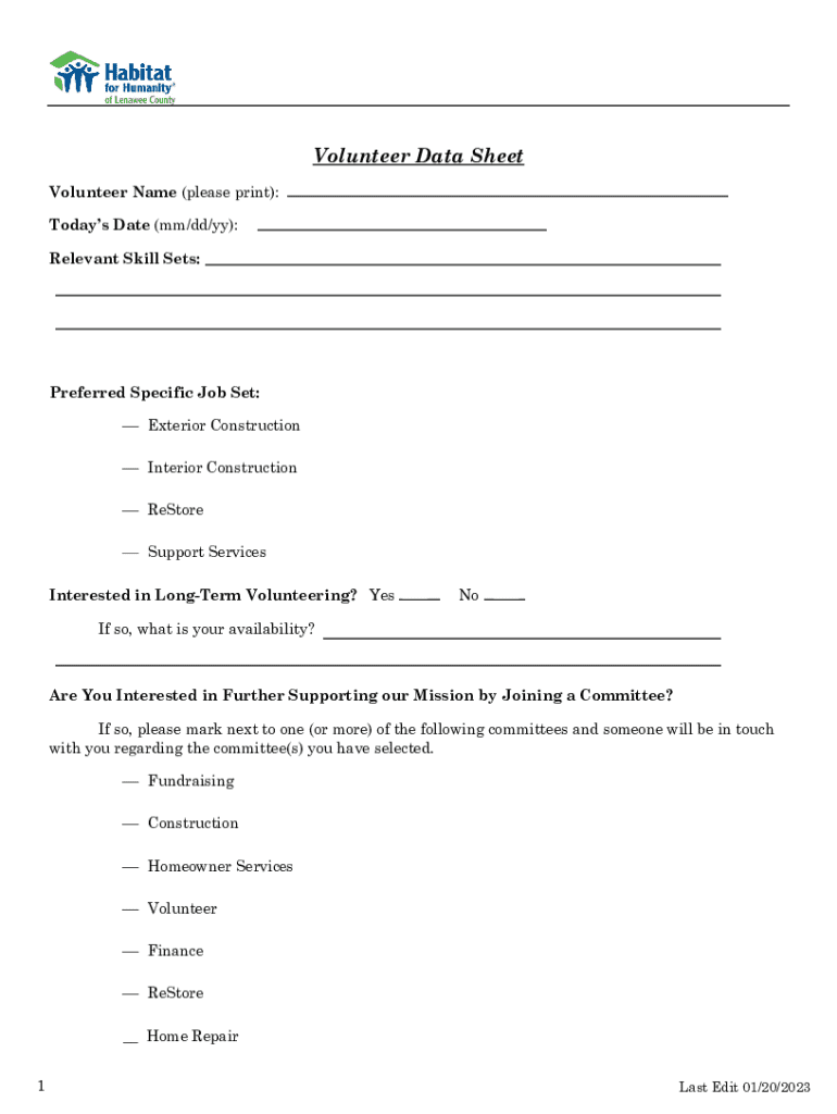 Volunteer Data Sheet Volunteer Name (please print): Todays Date (mm/dd/yy): Relevant Skill Sets:Preferred Specific Job Set: Exterior Construction Interior Construction ReStore Support Services Interested in LongTerm Volunteering? YesNoIf so, what is your availability?Are You Interested in Further Supporting our Mission by Joining a Committee? If so, please mark next to one (or more) of the following committees and someone will be in touch with you regarding the committee(s) you have selected