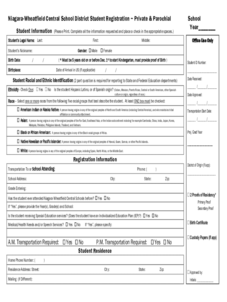 Get the free Niagara-Wheatfield Central School District Student Registration Private & Parochial