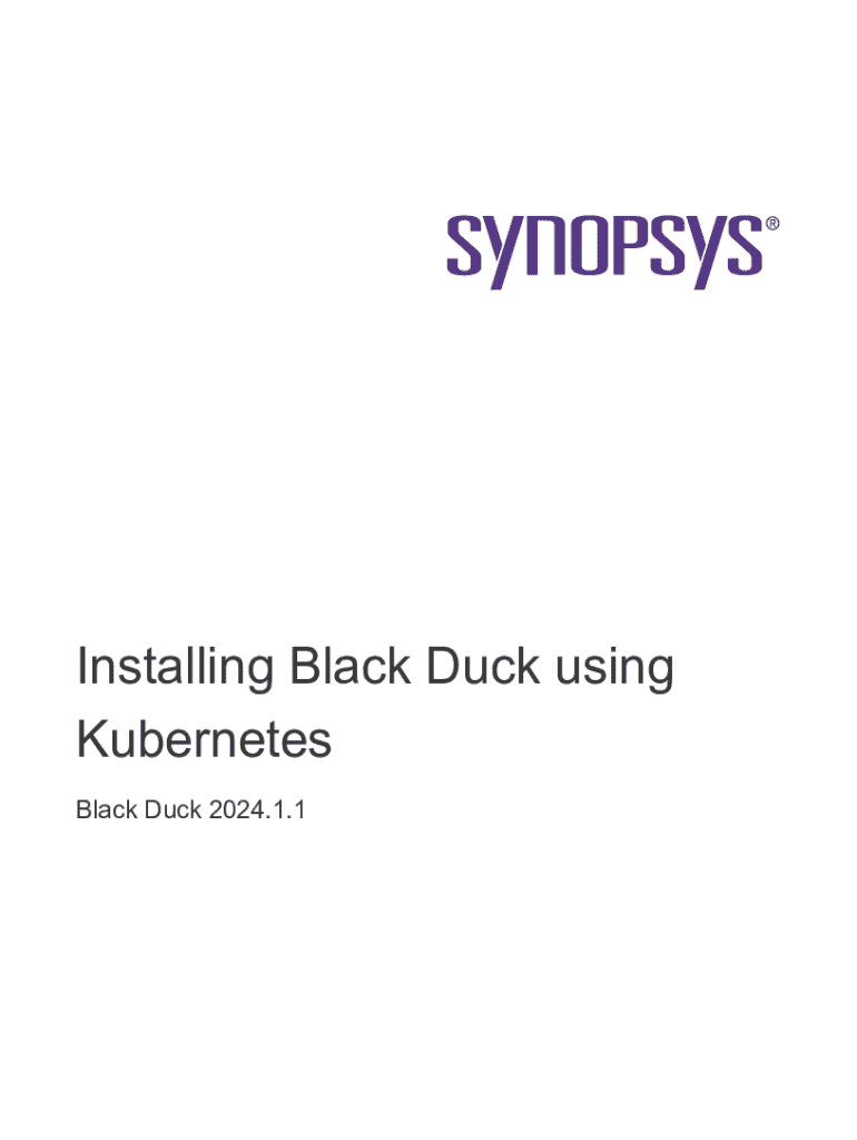 Installing Black Duck using Kubernetes Black Duck 2024.1.1Black DuckCopyright 2024 by Synopsys. All rights reserved. All use of this documentation is subject to the license agreement between Black Duck Software, Inc. and the licensee. No part of the contents of this document may be reproduced or transmitted in any form or by any means without the prior written permission of Black Duck Software, Inc. Black Duck, Know Your Code, and the Black Duck logo are registered trademarks of Black Duck...