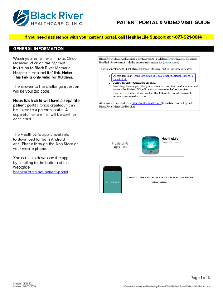 PATIENT PORTAL & VIDEO VISIT GUIDE If you need assistance with your patient portal, call HealtheLife Support at 18776218014 GENERAL INFORMATION Watch your email for an invite. Once received, click