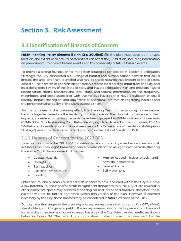 Section 3. Risk Assessment 3.1 Identification of Hazards of Concern FEMA Planning Policy Element B1: 44 CFR 201.6(c)(2)(i): The plan must describe the type, location, and extent of all natural hazards that can affect the jurisdiction, including information on previous occurrences of hazard events and the probability of future hazard events. To provide a strong foundation for mitigation strategies considered in Section 5 (Mitigation Strategy), the City considered a full range of natural and...