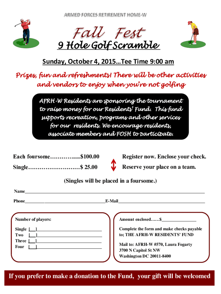 9 Hole Golf Scramble Sunday, October 4, 2015Tee Time 9:00 am Prizes, fun and refreshments! There will be other activities and vendors to enjoy when youre not golfing AFRHW Residents are sponsoring the tournament to raise money for our Residents Fund. This fund supports recreation, programs and other services for our residents. We encourage residents, associate members and FOSH to participate.Each foursome.....$100.00Register now. Enclose your check.Single$ 25