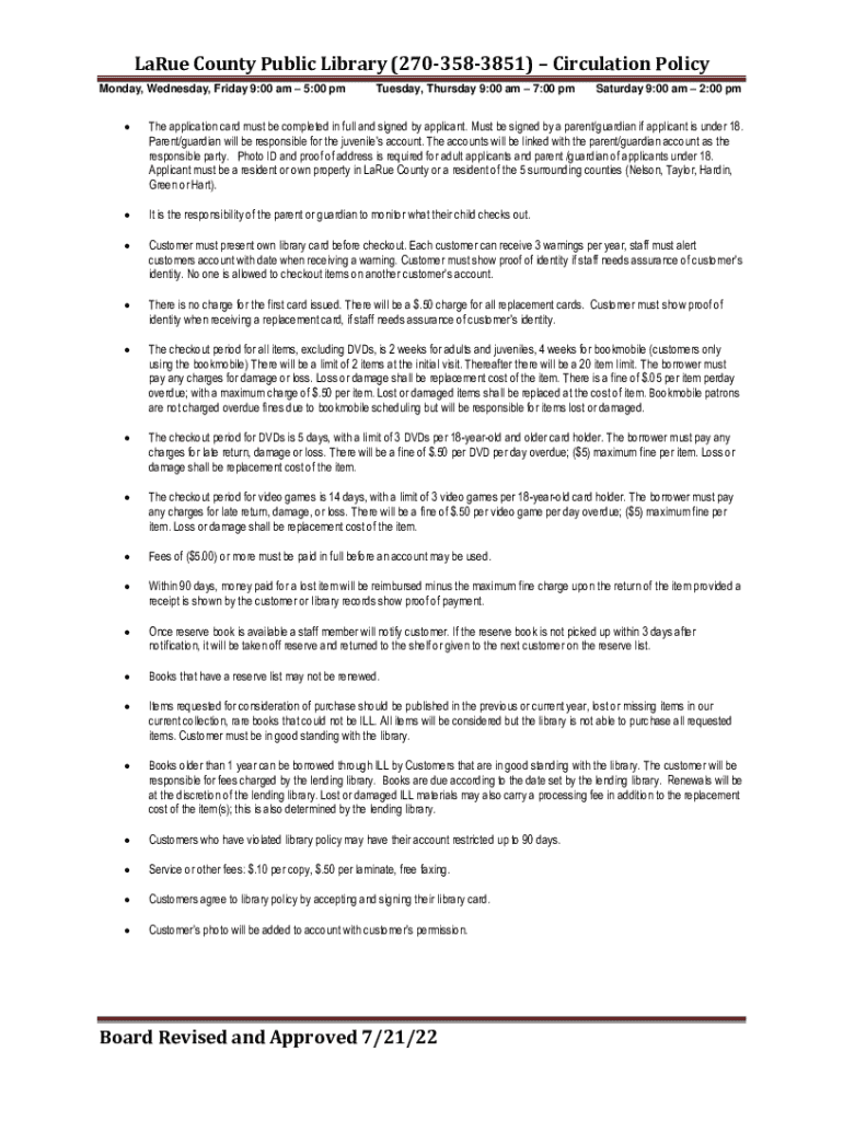 Get the free LaRue County Public Library (270-358-3851)Circulation Policy