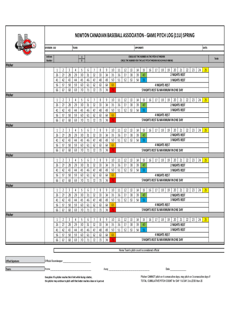 The Summer NCBA Pitch Count Form serves as a crucial tool for baseball teams participating in the National Club Baseball Association's summer leagues. Designed to track the number of pitches thrown by players in each game, this form plays an integral role in promoting the health and safety of young athletes. With increasing awareness of arm injuries among young pitchers, it is essential for coaches, players, and parents to understand the significance of monitoring pitch counts and adhering to specific guidelines.