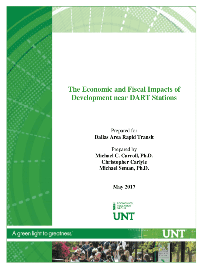 Section I: ECONOMIC AND FISCAL IMPACTS OF THE DART LIGHT RAIL SYSTEM: 1999 2013The Economic and Fiscal Impacts of Development near DART StationsPrepared for Dallas Area Rapid Transit Prepared by Michael C. Carroll, Ph.D. Christopher Carlyle Michael Seman, Ph.D.May 2017University of North Texas Economics Research GroupPg. 1Section I: ECONOMIC AND FISCAL IMPACTS OF THE DART LIGHT RAIL SYSTEM: 1999 2013TABLE OF CONTENTS Section I: Economic and Fiscal Impacts of the DART Light Rail System: 1999 2013