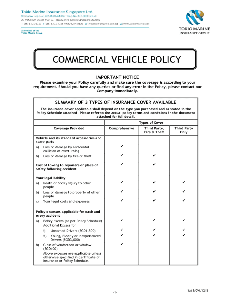 COMMERCIAL VEHICLE POLICY IMPORTANT NOTICE Please examine your Policy carefully and make sure the coverage is according to your requirement. Should you have any queries or find any error in the Policy, please contact our Company immediately.SUMMARY OF 3 TYPES OF INSURANCE COVER AVAILABLE The insurance cover applicable shall depend on the type you purchased and as stated in the Policy Schedule attached. Please refer to the actual policy terms and conditions in the document attached for full...