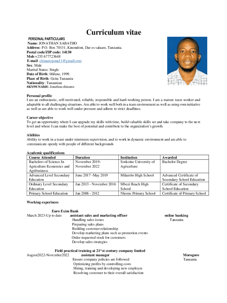 Curriculum vitae PERSONAL PARTICULARS Name: JONATHAN SABATHO Address: P.O. Box 70131, Kinondoni, Dar es salaam, Tanzania. Postal code/ZIP code: 14130 Mob:+255 677723648 Email: chinamojona11@gmail.com Sex: Male Marital Status: Single Date of Birth: 06June, 1999. Place of Birth: Geita Tanzania Nationality: Tanzanian SKYPE NAME: Jonathan chinamoPersonal profile I am an enthusiastic, selfmotivated, reliable, responsible and hardworking person. I am a mature team worker and adaptable to all...