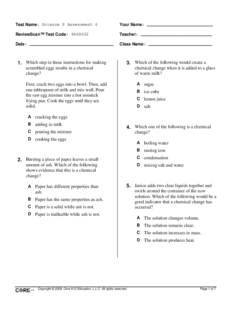 Test Name: Science 8 Assessment 6Your Name: ___ReviewScan Test Code: 9668632Teacher: ___Date: ___Class Name: ___1. Which step in these instructions for making3. Which of the following would create