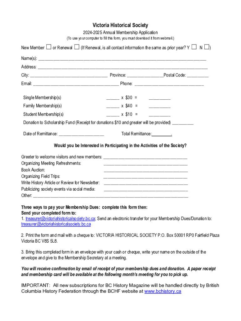 For those looking to learn more about the Victoria Historical Society Form or seeking assistance with the submission process, the Victoria Historical Society welcomes inquiries. You can reach out directly via phone or email for immediate support. Additionally, engaging with the Society through social media platforms can provide real-time updates and opportunities for community participation.