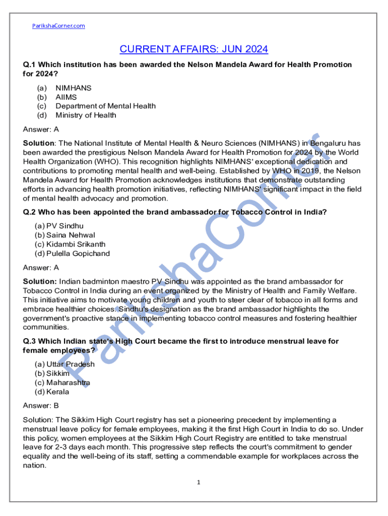 ParikshaCorner.comCURRENT AFFAIRS: JUN 2024 Q.1 Which institution has been awarded the Nelson Mandela Award for Health Promotion for 2024? (a) (b) (c) (d)NIMHANS AIIMS Department of Mental Health