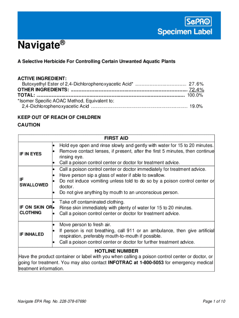 Navigate A Selective Herbicide For Controlling Certain Unwanted Aquatic PlantsACTIVE INGREDIENT: Butoxyethyl Ester of 2,4Dichlorophenoxyacetic Acid* ....................................... 27.6% OTHER INGREDIENTS: ......................................................................................... 72.4% TOTAL: ................................................................................................................. 100.0% *Isomer Specific AOAC Method, Equivalent to:...