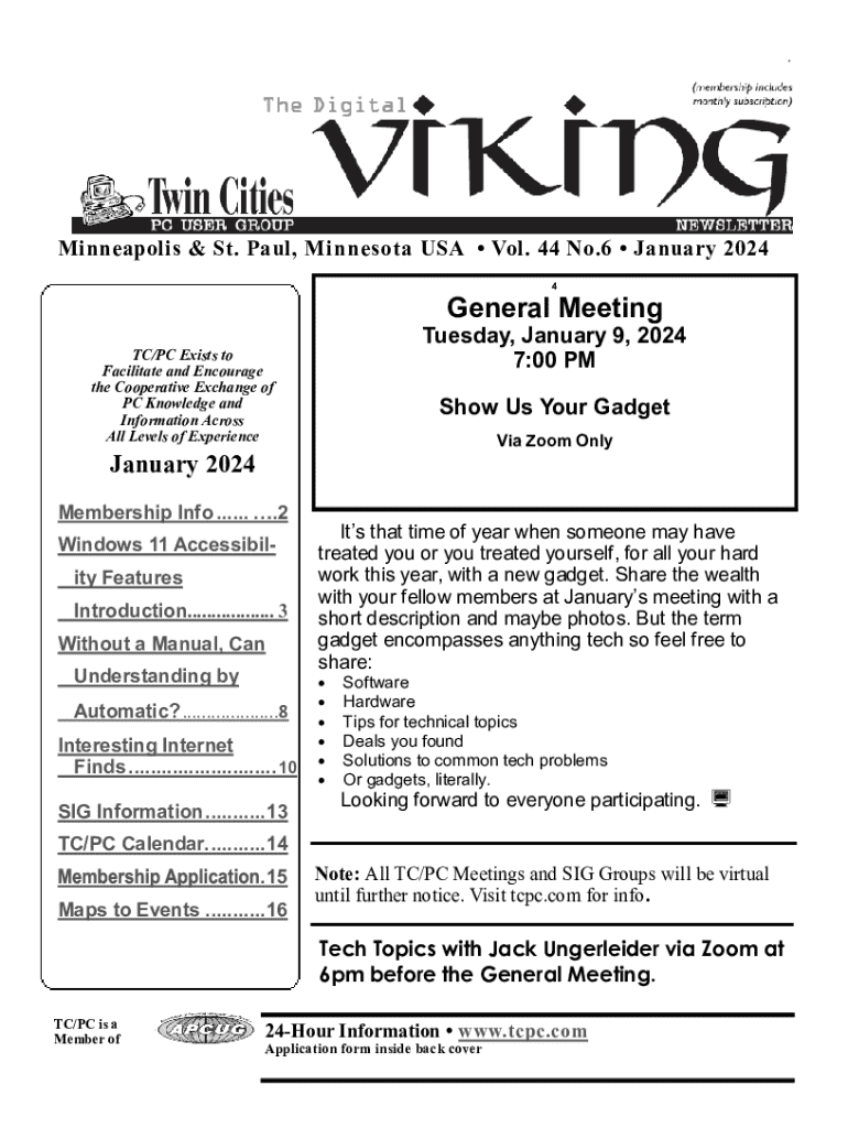Minneapolis & St. Paul, Minnesota USA Vol. 44 No.6 January 2024 4General MeetingTuesday, January 9, 2024 7:00 PMTC/PC Exists to Facilitate and Encourage the Cooperative Exchange of PC Knowledge and Information Across All Levels of ExperienceShow Us Your Gadget Via Zoom OnlyJanuary 2024 Membership Info ...... .2 Windows 11 Accessibility Features Introduction.................. 3 Without a Manual, Can Understanding by Automatic? ....................8 Interesting Internet Finds