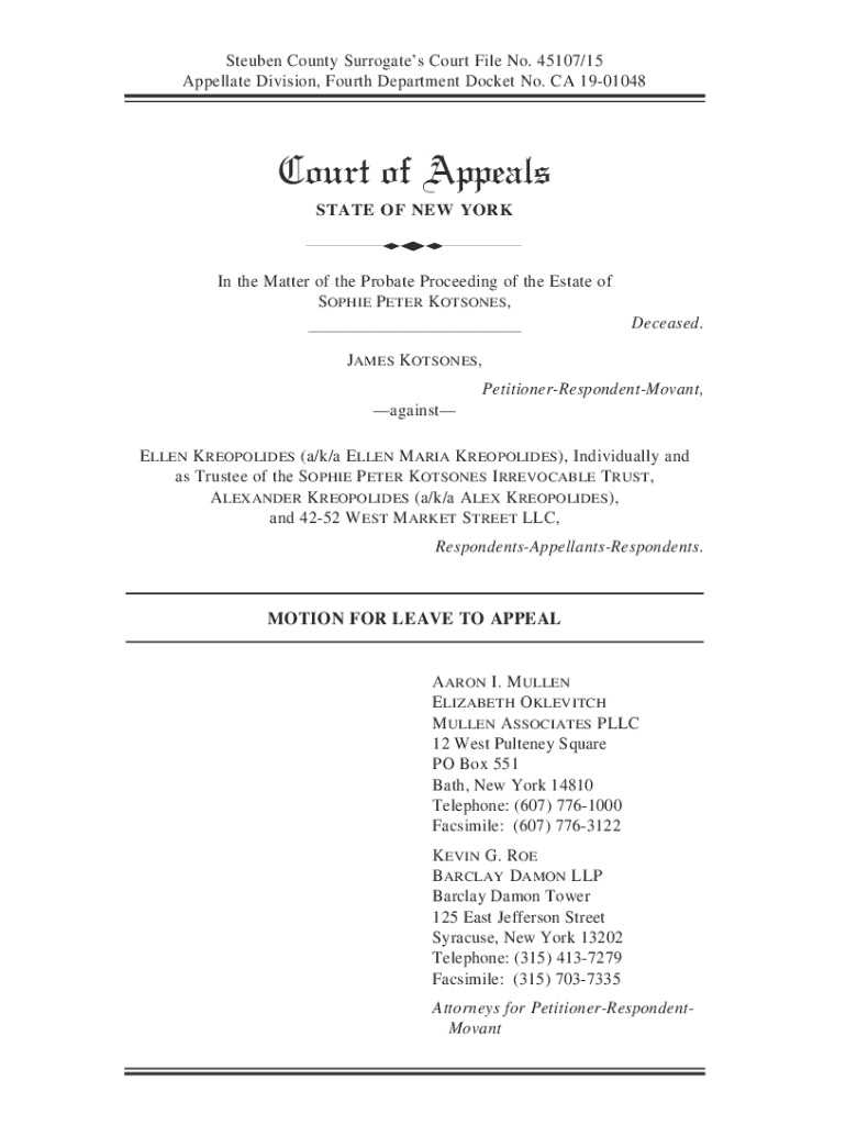Steuben County Surrogates Court File No. 45107/15 Appellate Division, Fourth Department Docket No. CA 1901048Court of Appeals STATE OF NEW YORKdIn the Matter of the Probate Proceeding of the Estate of SOPHIE PETER KOTSONES , Deceased.JAMES KOTSONES , PetitionerRespondentMovant, against ELLEN KREOPOLIDES (a/k/a ELLEN MARIA KREOPOLIDES ), Individually and as Trustee of the SOPHIE PETER KOTSONES IRREVOCABLE TRUST , ALEXANDER KREOPOLIDES (a/k/a ALEX KREOPOLIDES ), and 4252 WEST MARKET