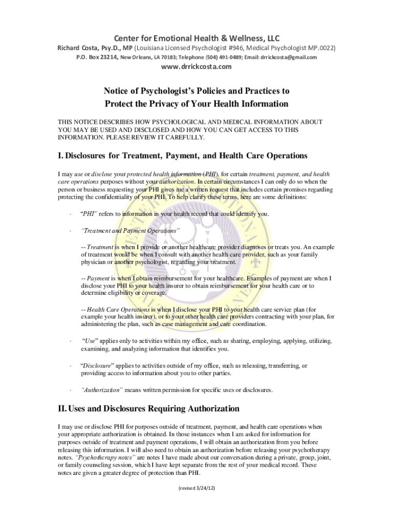 The Richard Costa Psy Form is a specialized document designed to facilitate psychological evaluations and assessments. Its purpose is to gather essential data regarding an individual's psychological state, behaviors, and emotions, providing a structured method for psychologists and counselors to evaluate mental health comprehensively.
