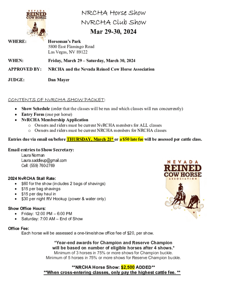 NRCHA Horse Show NvRCHA Club Show Mar 2930, 2024 WHERE:Horsemans Park 5800 East Flamingo Road Las Vegas, NV 89122WHEN:Friday, March 29 Saturday, March 30, 2024APPROVED BY:NRCHA and the Nevada Reined Cow Horse AssociationJUDGE:Dan MayerCONTENTS OF NvRCHA SHOW PACKET: Show Schedule (order that the classes will be run and which classes will run concurrently) Entry Form (one per horse) NvRCHA Membership Application o Owners and riders must be current NvRCHA members