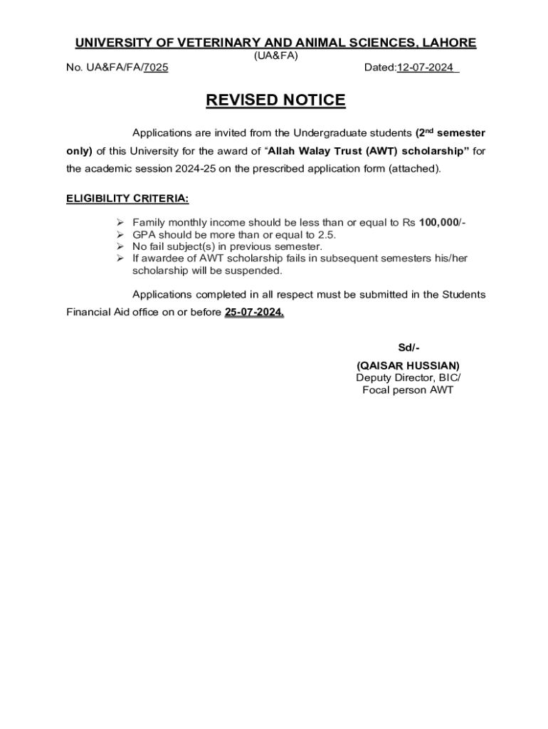UNIVERSITY OF VETERINARY AND ANIMAL SCIENCES, LAHORE (UA&FA) No. UA&FA/FA/7025Dated:12072024_REVISED NOTICE Applications are invited from the Undergraduate students (2nd semester only) of this University for the award of Allah Walay Trust (AWT) scholarship for the academic session 202425 on the prescribed application form (attached). ELIGIBILITY CRITERIA: Family monthly income should be less than or equal to Rs 100,000/GPA should be more than or equal to 2.5. No fail subject(s) in previous...