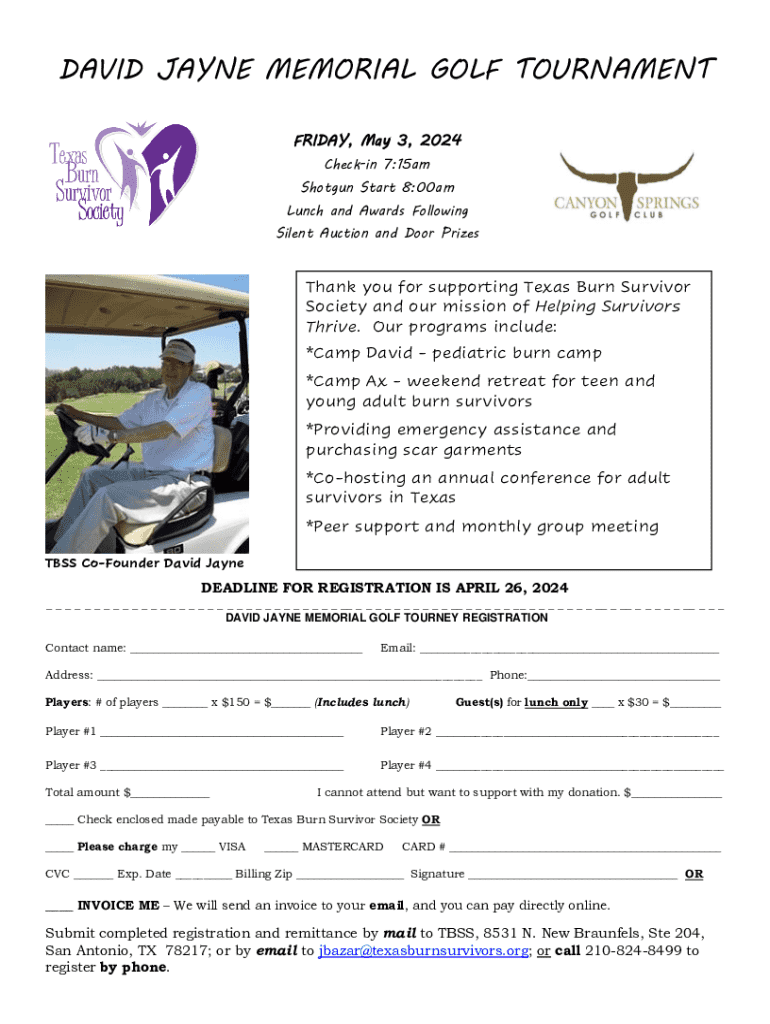 DAVID JAYNE MEMORIAL GOLF TOURNAMENT FRIDAY, May 3, 2024, Checking 7:15am Shotgun Start 8:00am Lunch and Awards Following Silent Auction and Door PrizesThank you for supporting Texas Burn Survivor